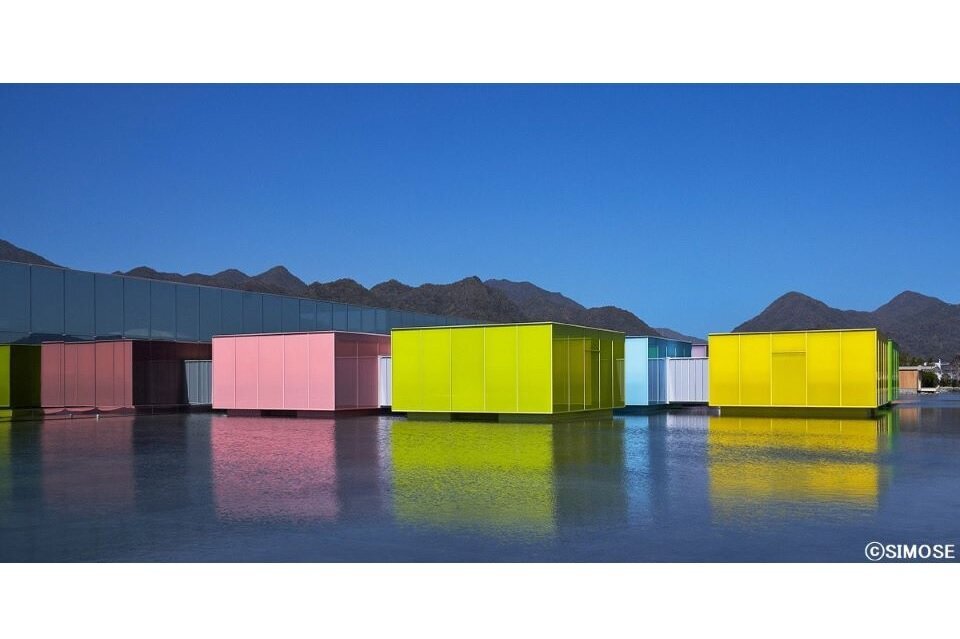 水盤の上に佇む8つの可動展示室は、水の浮力によって配置パターンが変更可能な世界でも類のない展示空間となっています。