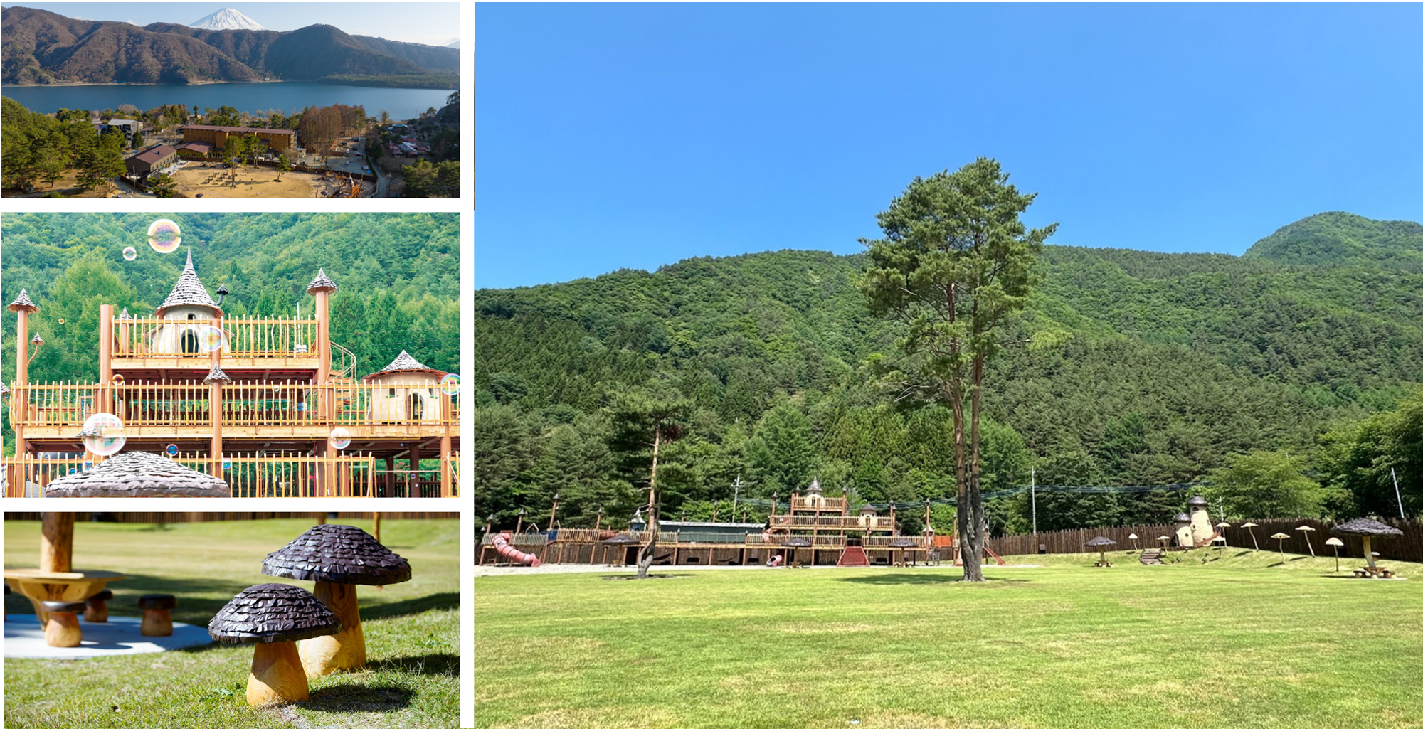 丸太に囲まれた広場には、巨大ツリーハウスや広大な芝生エリアがあります。