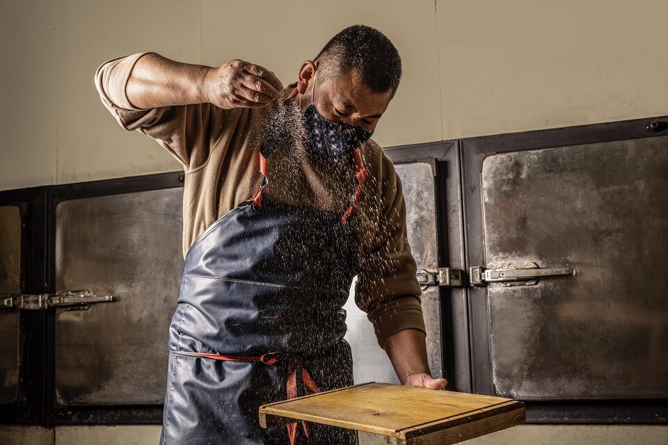 長い漁船生活から帰港した漁師さんの口にあうようにちょっと濃いめで、陸の味のつまった醤油や味噌を生地に使用。中のこし餡とのあまじょっぱいハーモニーが人気です。