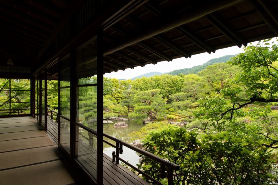 池を中心に配置され、遠景に嵐山や小倉山を借景(しゃっけい)として巧みに取り入れた壮大な景観が魅力です。