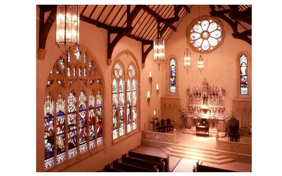 館内には、1800年代中心のアンティークステンドグラスが配され、セント・ラファエル礼拝堂の壁一面のステンドグラスは、その美しさに目を奪われるほどです。