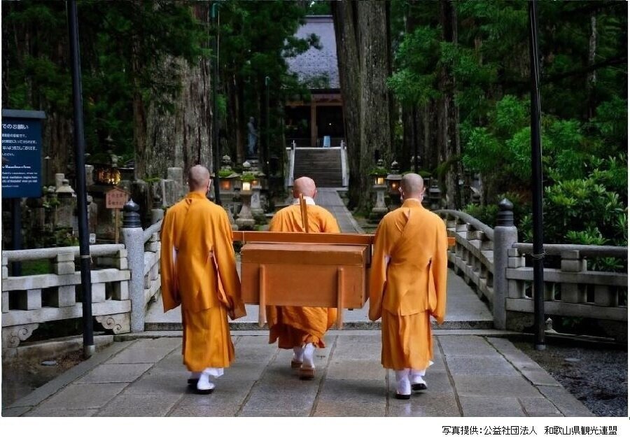 現地ガイドがご案内します。 雨の日も風の日も絶えることなく毎日2回、早朝6時からと10時30分から 弘法大師・空海に食事を運ぶ「生身供(しょうじんぐ)」の行事が執り行われています。地蔵尊に味見をしていただく行事をして、口を覆った先導と2人の僧侶が燈籠堂へ運びます。 高野山らしい神聖な光景をごらんください。