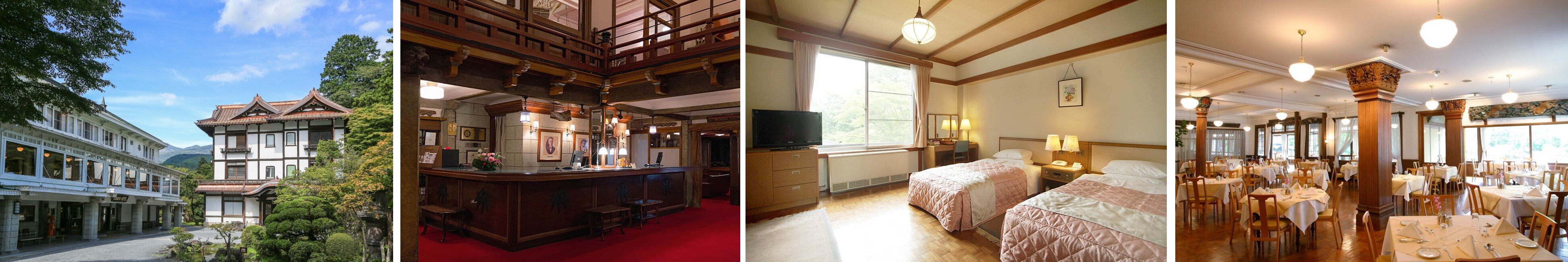 日光金谷ホテル外観、フロント、客室一例、ダイニングルーム